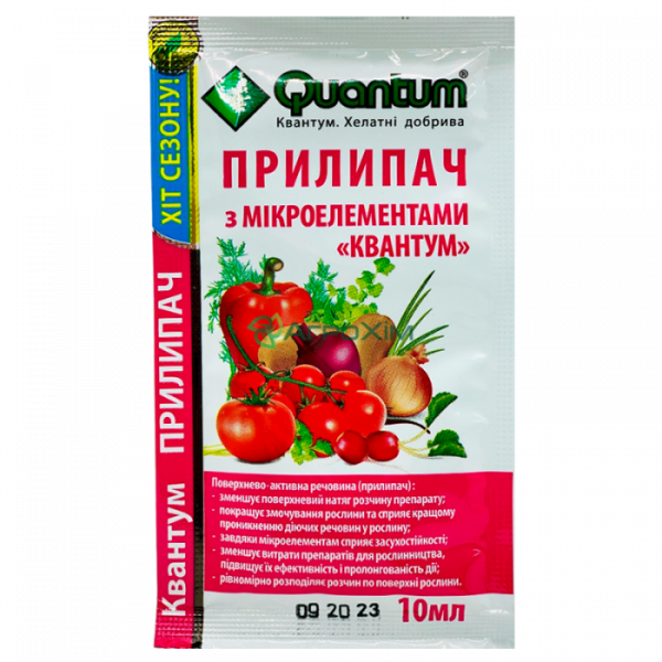Квантум Прилипач – це речовина поверхнево-активного долучення для ефективної дії фунгіцидних і інсектицидних препаратів, значно полегшує догляд за сільськогосподарськими рослинами. Препарат змінює в'язкість готового розчину, перешкоджає стіканню розчину з листя і стебел рослин, знижує добові норми витрат і підвищує ефективність діючих речовин. Утворює на поверхні рослин плівку, яка гарантує більш стійке і повне спрацювання препаратів. Найбільш доцільно використовувати прилипач для обприскування рослин на культурах, які мають сильний восковий наліт (капуста, цибуля, персики та ін.)