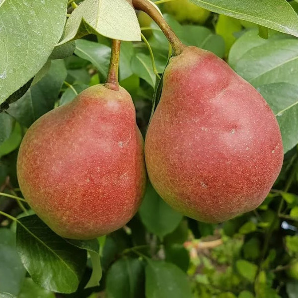 Плоды грушевидные, короткие. Вес одного 140-250 г. Спелые груши красивого жёлтого цвета с выраженным красным бочком. Плоды внутри белоснежные, сочные и очень сладкие.