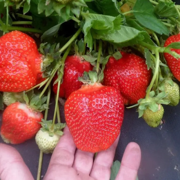 - плоды сладкие, сочные, с ароматом земляники, красного цвета, с глянцем, форма приплюснутого конуса, крупные, масса 30-35 г, поспевают в июне;