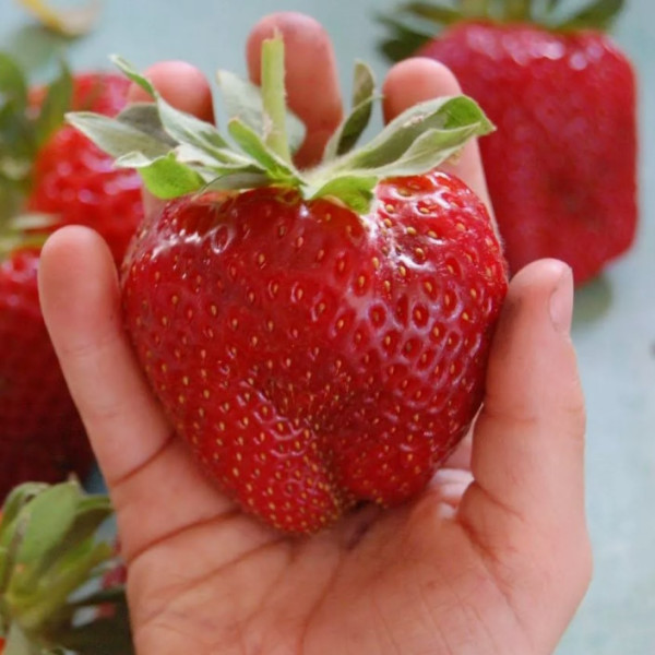 Плоды вырастают до крупных размеров, массой до 60-75 г. Клубничные ягоды красивые, алой окраски. Мякоть очень сахаристая с земляничным душистым ароматом, довольно сочная. Ягодки упругие, хорошо переносят транспортировки, не портятся.