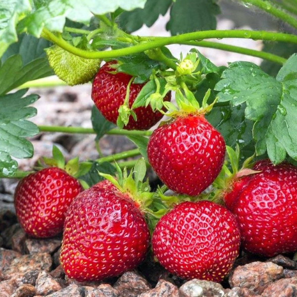 Ярко-красные ягоды с мясистой и сочной мякотью. Вкус плодов сладкий с незначительной кислинкой и земляничным ароматом. Каждая ягода весьма крупная, весом до 40 грамм.