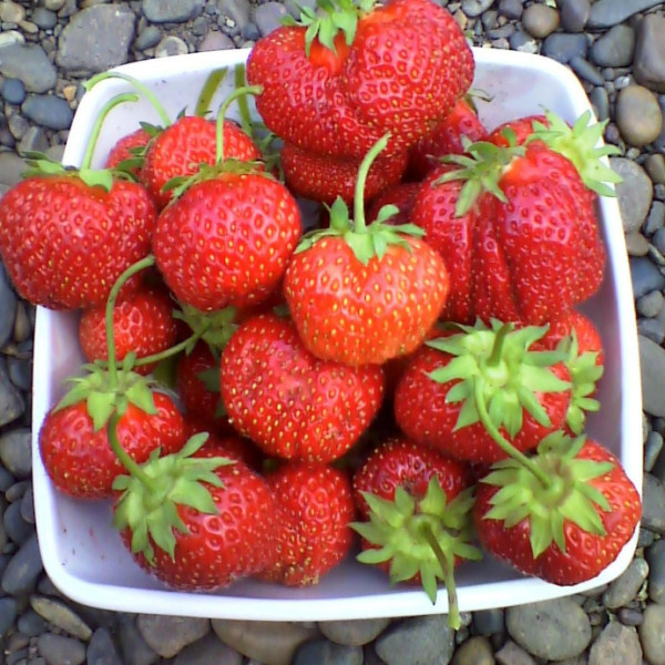 Ягоды — тупоконической формы, иногда ребристые, средней массой 17-30 г, отдельные ягоды достигают 60 г. Спелая клубника темно-красного цвета, с глянцевым блеском и выраженным фруктовым ароматом. Мякоть упругой консистенции, сочная и сладкая.