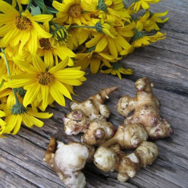 Топінамбур (Helianthus tuberosus, Jerusalem artichoke). Топінамбур або земляна груша - це багаторічна трав'яниста бульбоносна рослина. У природних умовах він зростає у Північній Америці. Його бульби мають солодкий горіховий смак, який порівнюють із артишоками та бразильськими горіхами. Наземна частина топінамбур дуже схожа на соняшник. Ця рослина досягає висоти від 2 до 4 м. Кущ стає досить густим і виробляє жовті суцвіття-кошики діаметром 4-8 см. Плоди-насінини, схожі на насіння у соняшнику. Листя велике, просте, до 20-25 см завдовжки. Стебло та інші частини рослини опушені. Стебло на зиму відмирає, а навесні з бульби з'являється нове.