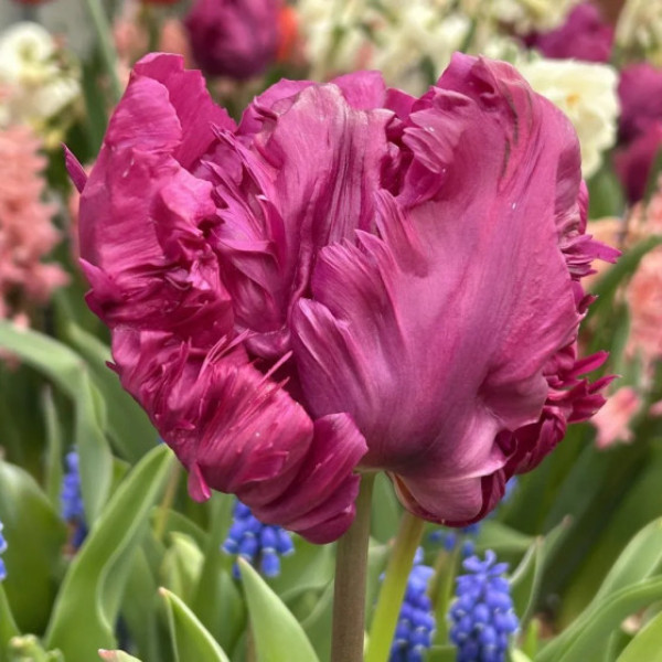 Сорт 'Parrot Prince' з класу Тюльпани папуги. Квітки незвичайні, величезні, тяжкі, розкішні, неправильної форми. Вони мають великі пелюстки, які дуже схожі на пір'я екзотичного птаха. Крім того, пелюстки скуйовджені, скручені, зморшкуваті, хвилясті. Забарвлення квіток - лілово-пурпурового кольору. Інтенсивність кольору інколи змінюється в залежності від клімату і навіть від одного сезону до іншого. Квітки із приємним солодким ароматом. Розмір квітки у широко відкритому вигляді становить близько 10 см в діаметрі. Висота келиха - 10-11 см, а його ширина - близько 8 см. Квітконоси міцні. Тому цей сорт здатний додати неповторний шарм будь-якому класичному букету чи квітковій композиції. Виростає до висоти 40-60 см. Цвітіння у травні.